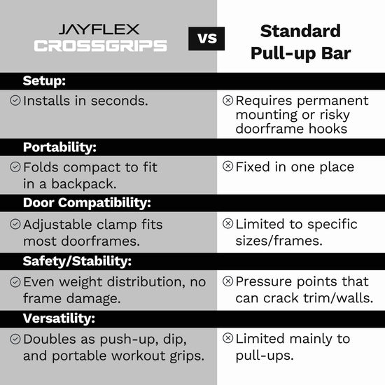 Unlike bulky pull-up bars that require installation or leave marks on your walls, CrossGrips provides a secure, stable, and portable solution. It’s designed for durability, versatility, and ease of use—giving you an effective upper-body workout anytime, anywhere.