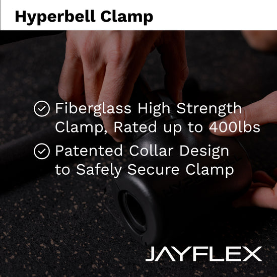Your dumbbell handle length must be at least 4.5” long to accommodate the width of the Hyperbell Bar clamps. (Most are 6”.) Lastly, the diameter of your dumbbell handle can be no bigger than 1.5” at its thickest point.